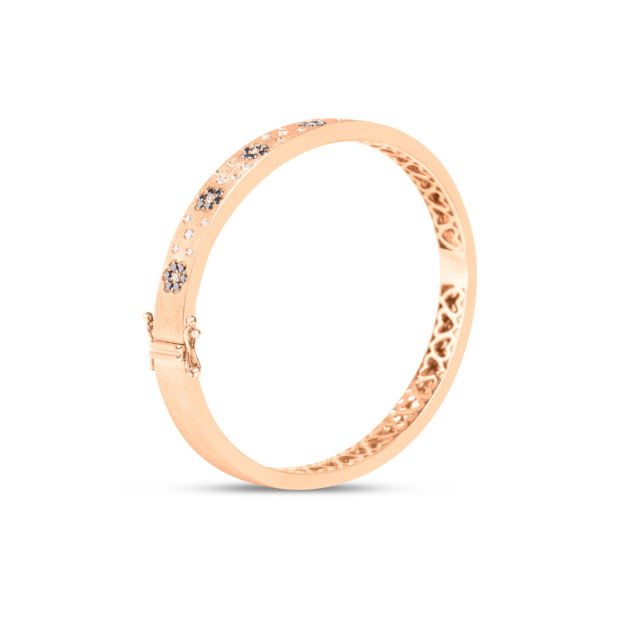 This black and white diamond flush flower bangle showcases a delicate floral design with contrasting diamonds set flush for a smooth, elegant look. Its refined craftsmanship and subtle sparkle make it an ideal accessory to enhance any outfit, offering a perfect blend of sophistication and everyday wearability.