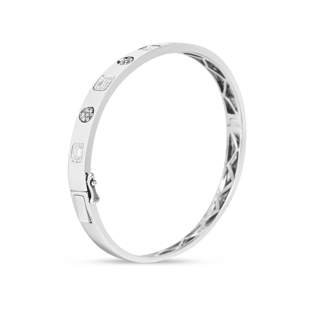Enhance your style with this exquisite bangle showcasing alternating emerald cut clusters and round pave diamonds. Its striking design draws attention effortlessly, making it an ideal accessory for both memorable events and everyday.