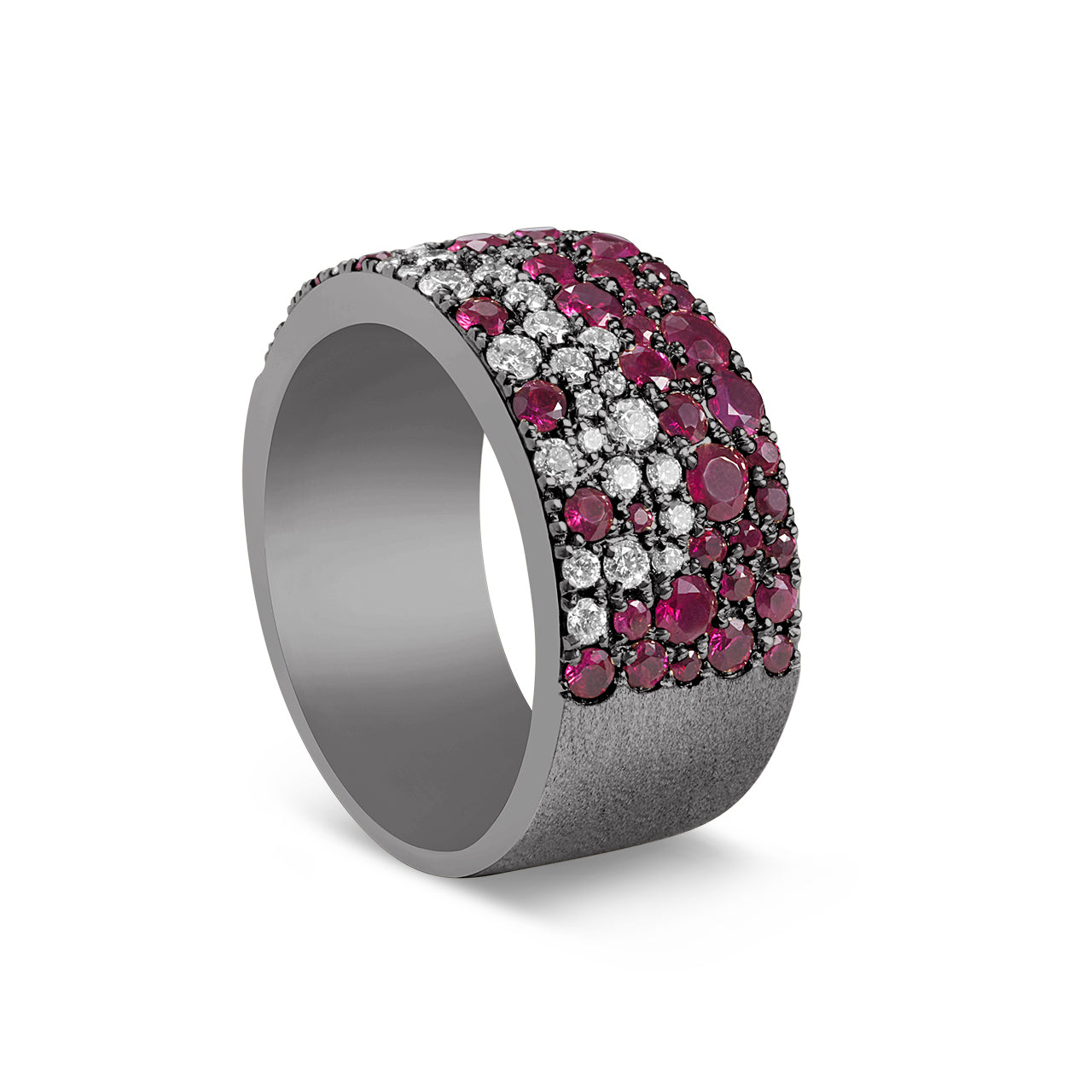Elevate your style with this Ruby & Diamond Pave Confetti Signature Cigar Band. Featuring a stunning scatter of rubies and diamonds set against a sleek satin finish, this ring offers a bold yet elegant look. Designed with a comfort fit, this ring ensures all-day wearability.
